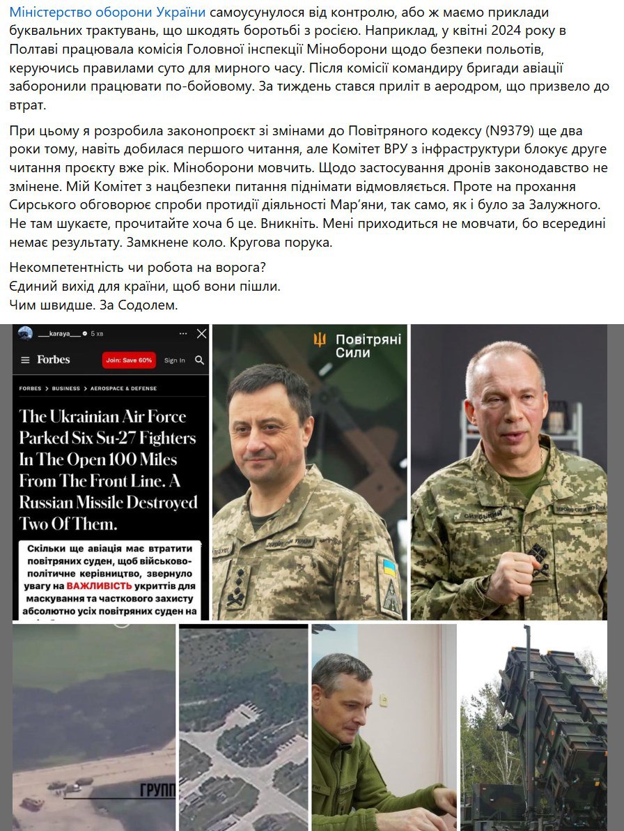 Народный депутат Марьяна Безуглая снова раскритиковала командование Воздушных сил ВСУ и призвала его уйти в отставку.