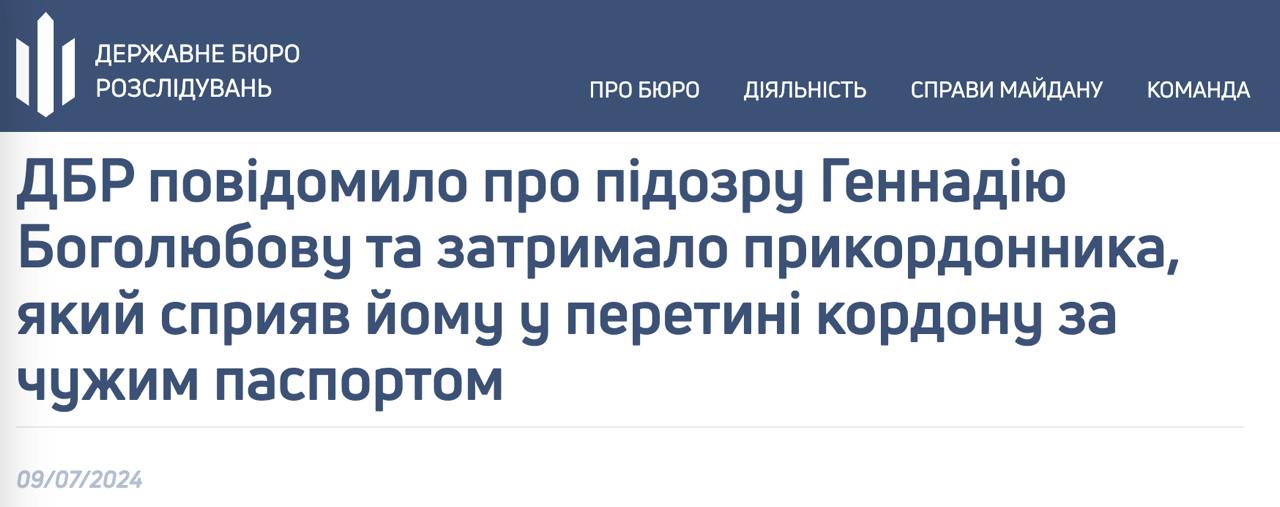 Сообщается, что бизнесмен выехал за границу в сопровождении своего близкого родственника 24 июня на поезде "Киев - Хелм", хотя по базам указано, что границу он не пересекал. Установлено, что Боголюбов выехал по недействительному паспорту гражданина Украины, физически находящегося в Украине и страну не покидавшего.