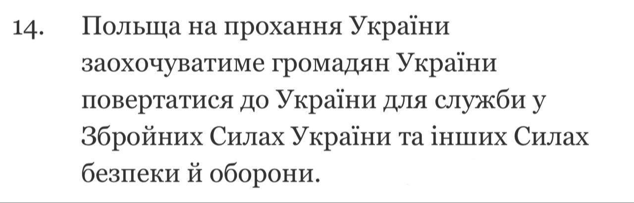 Об этом говорится в 14-м пункте договора о безопасности, заключенного между Польшей и Украиной.
