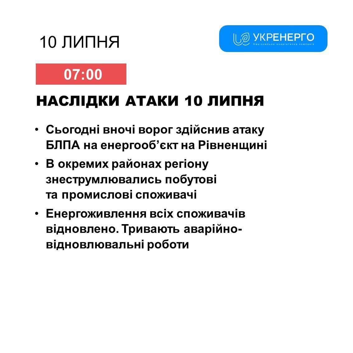 Ночью 10 июля российские беспилотники атаковали энергетический объект в Ровенской области.