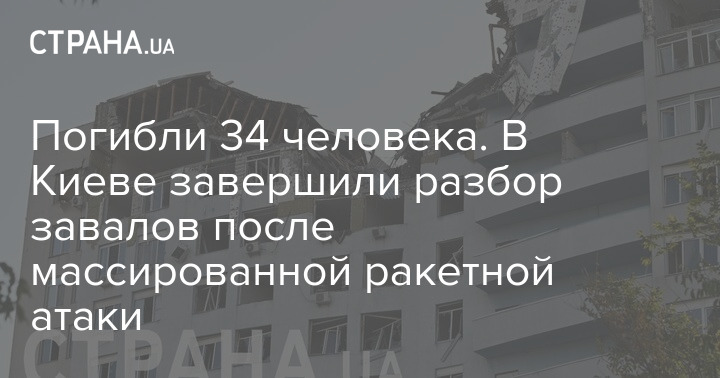 В Киеве завершили разбор завалов после обстрела 8 июля. В результате массированной ракетной атаки погибли 34 человека, в частности пятеро детей. Пострадал 121 человек, в том числе 10 детей. Известно, что 10 человек спасли.