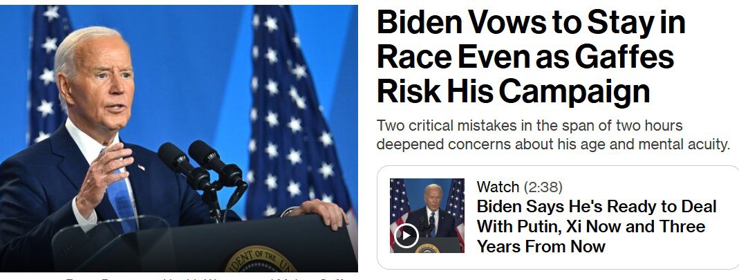 "Байден поклялся, что останется в президентской гонке, но две критические ошибки в течение двух часов усилили опасения по поводу остроты его ума", - пишет агентство Bloomberg.