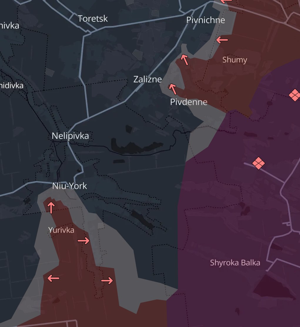Судя по карте Deep State, сейчас одной из целей может быть замыкание "мини-котла" по линии Южное - Нью-Йорк.