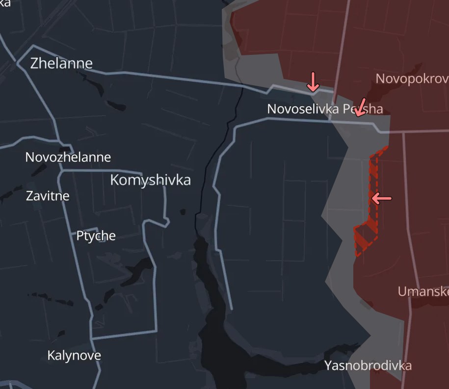На фронте российские войска, по данным паблика Deep State, продвинулись на Покровском направлении. Они наступают южнее Новоселовки Первой, пытаясь отрезать деревню с фланга и вынудить ВСУ ее покинуть. И открывая путь на Желанное.