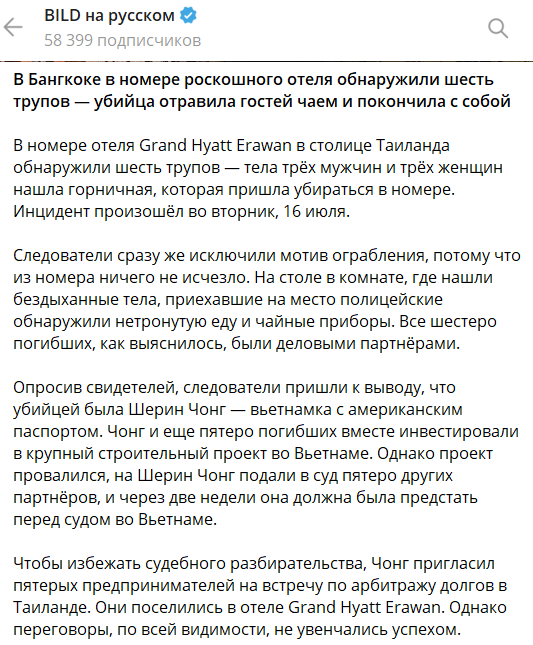 В роскошном отеле Бангкока Grand Hyatt Erawan горничная обнаружила шесть трупов: трёх мужчин и трёх женщин.