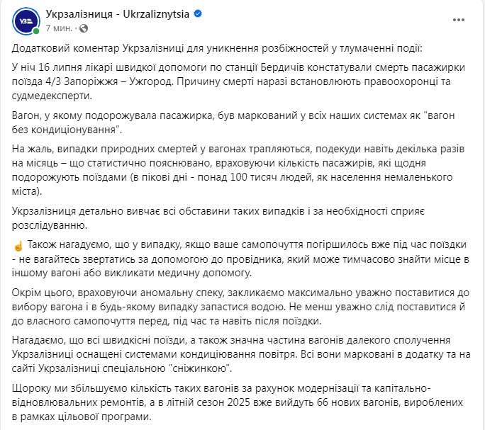 По ее информации, в ночь на 16 июля врачи скорой помощи по станции Бердичев констатировали смерть пассажирки поезда 4/3 "Запорожье – Ужгород". Причину смерти устанавливают правоохранители и судмедэксперты. Вагон, в котором путешествовала пассажирка, был маркирован как вагон без кондиционирования.