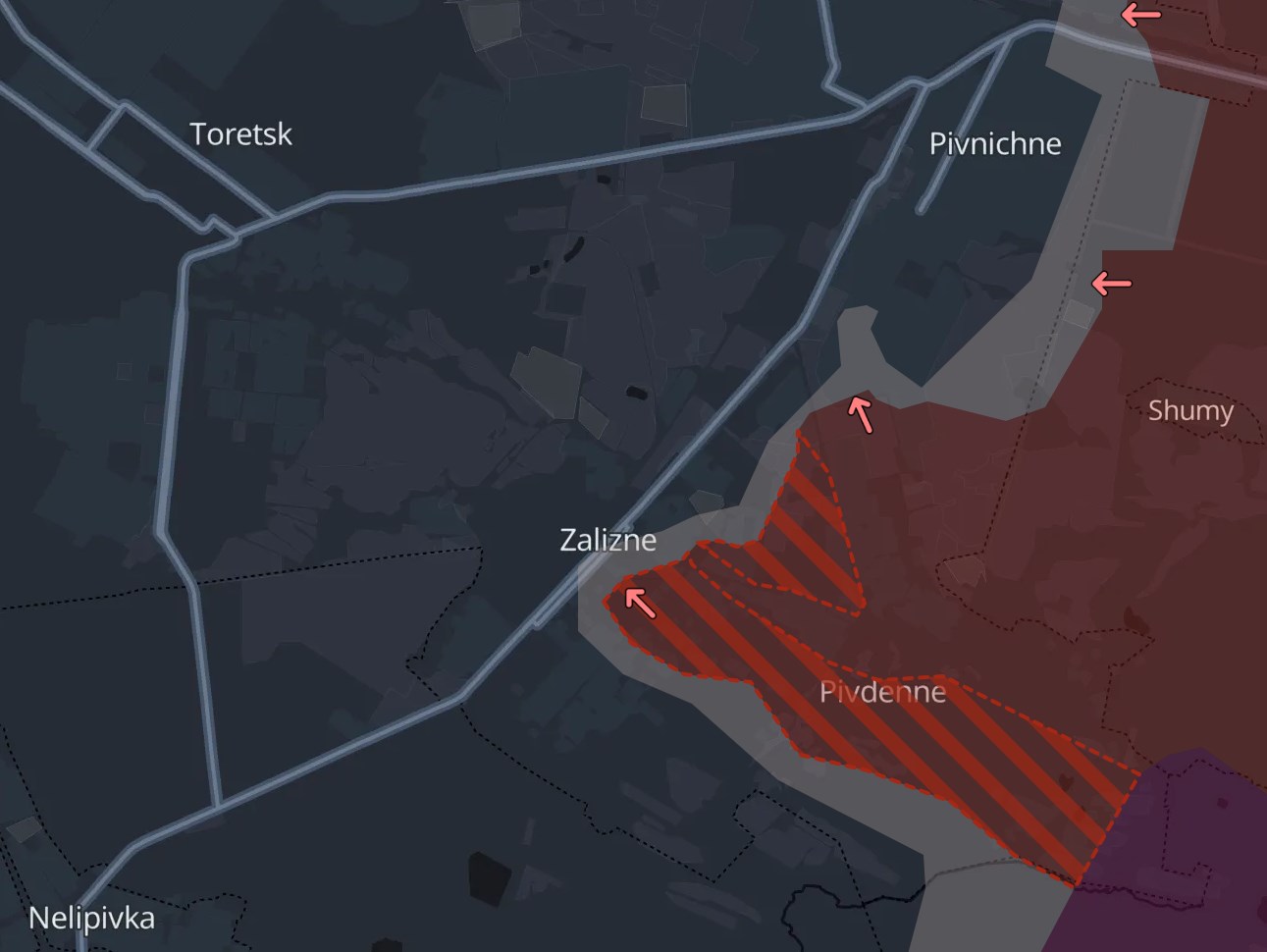 К востоку от Торецка россияне продвинулись в Южном, а также вошли в село Железное, с которого путь открывается уже на Торецк.