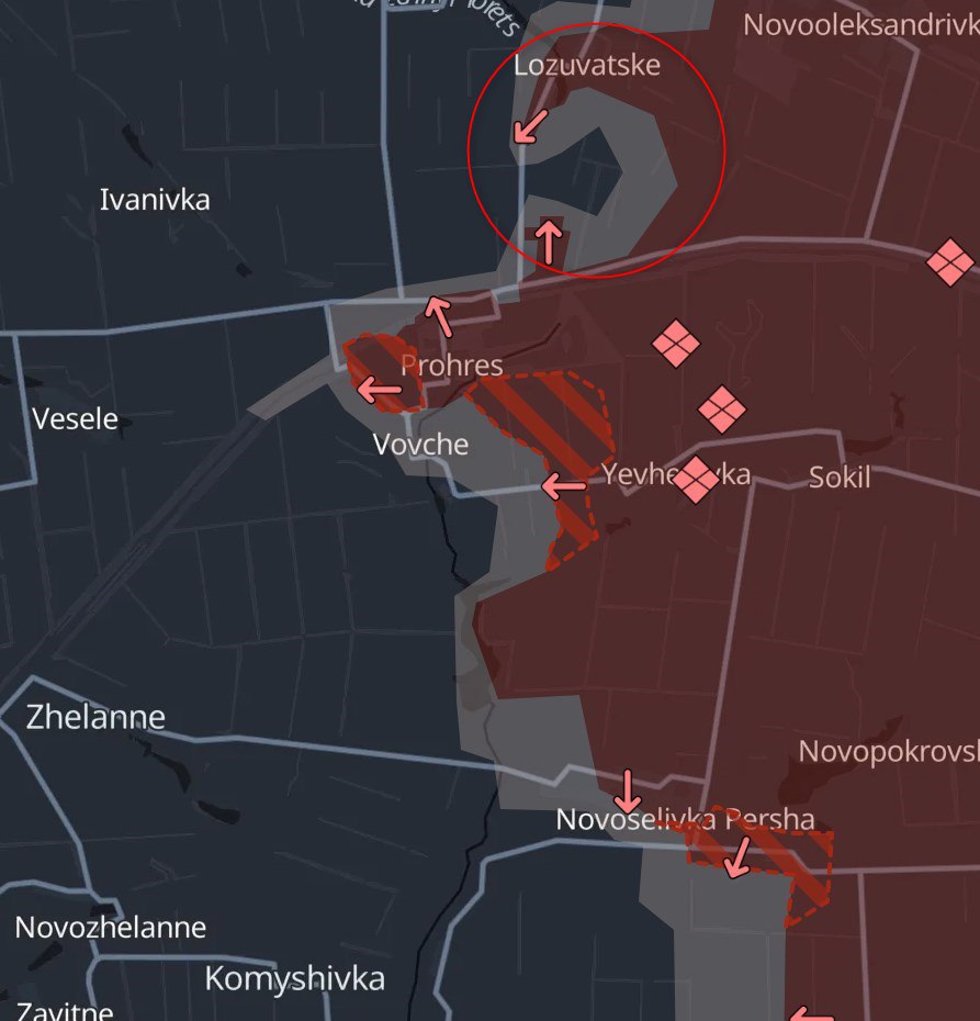 К северу от Прогресса РФ пытается окружить часть группировки ВСУ под Лозоватским (помечено на карте) и пробиться к Ивановскому. Приказа на отход нет, пишет Deep State со ссылкой на бойцов 31-й бригады, которые попали практически в окружение.