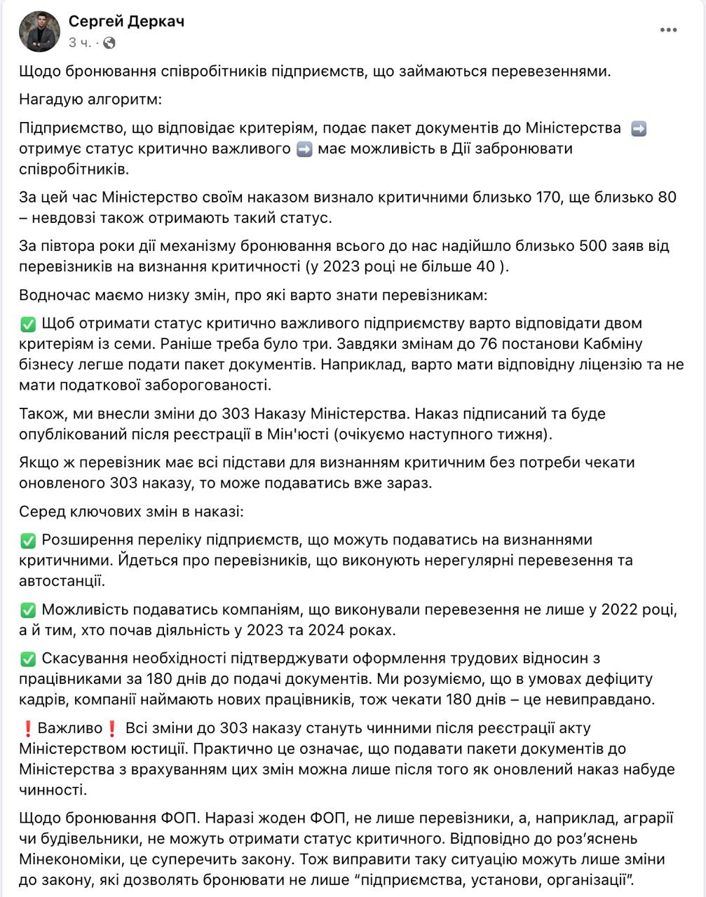 Для перевозчиков упрощают оформление брони от мобилизации сотрудников. Об этом сообщает заместитель министра развития общин, территорий и инфраструктуры Сергей Деркач.