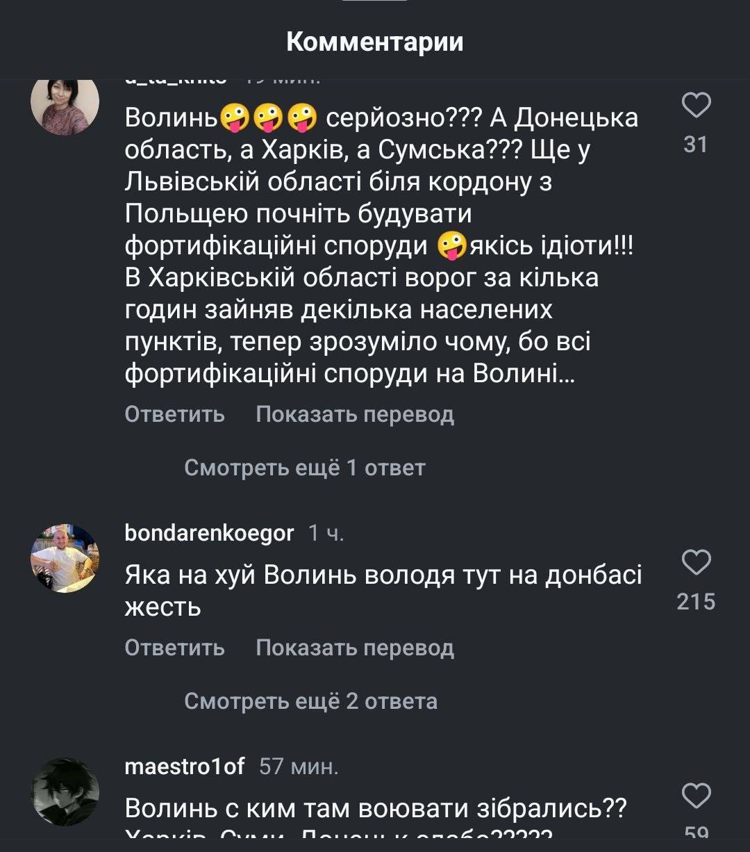 - "Волынь, серьезно? А Донецкая область, а Харьков, а Сумская? Еще во Львовской области у границы с Польшей начните строить. В Харьковской области враг за несколько часов занял несколько населенных пунктов, теперь понятно, почему: потому что все фортификационные сооружения на Волыни…"