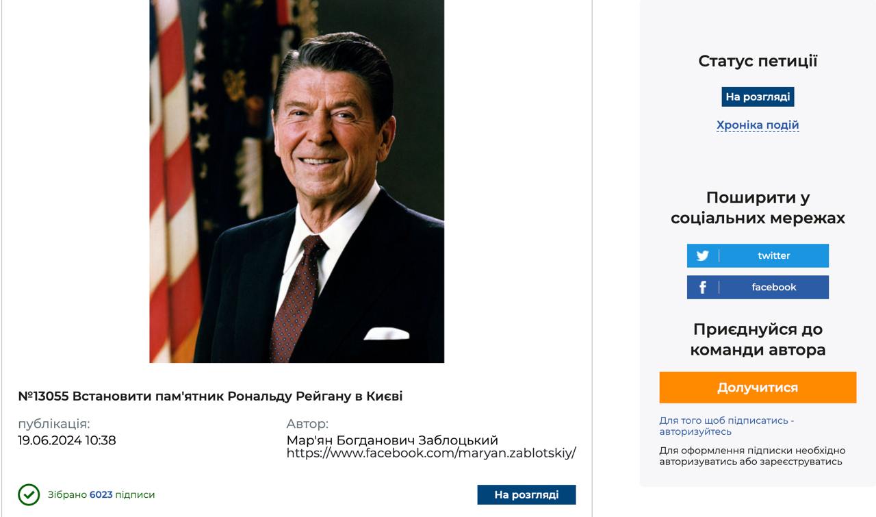 Петиция об установлении памятника 40-му президенту США Рональду Рейгану в Киеве набрала необходимые 6 тысяч голосов и передана на рассмотрение властей.