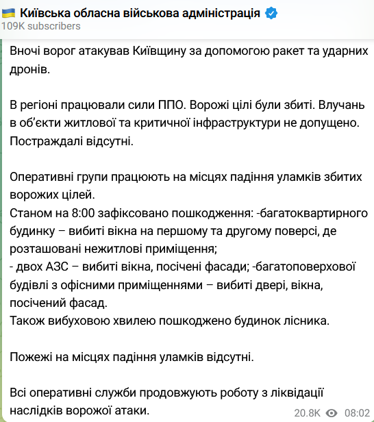 В Киевской области обломками от ночной атаки РФ повреждены многоэтажка, две АЗС, многоэтажное здание с офисами и дом лесника.