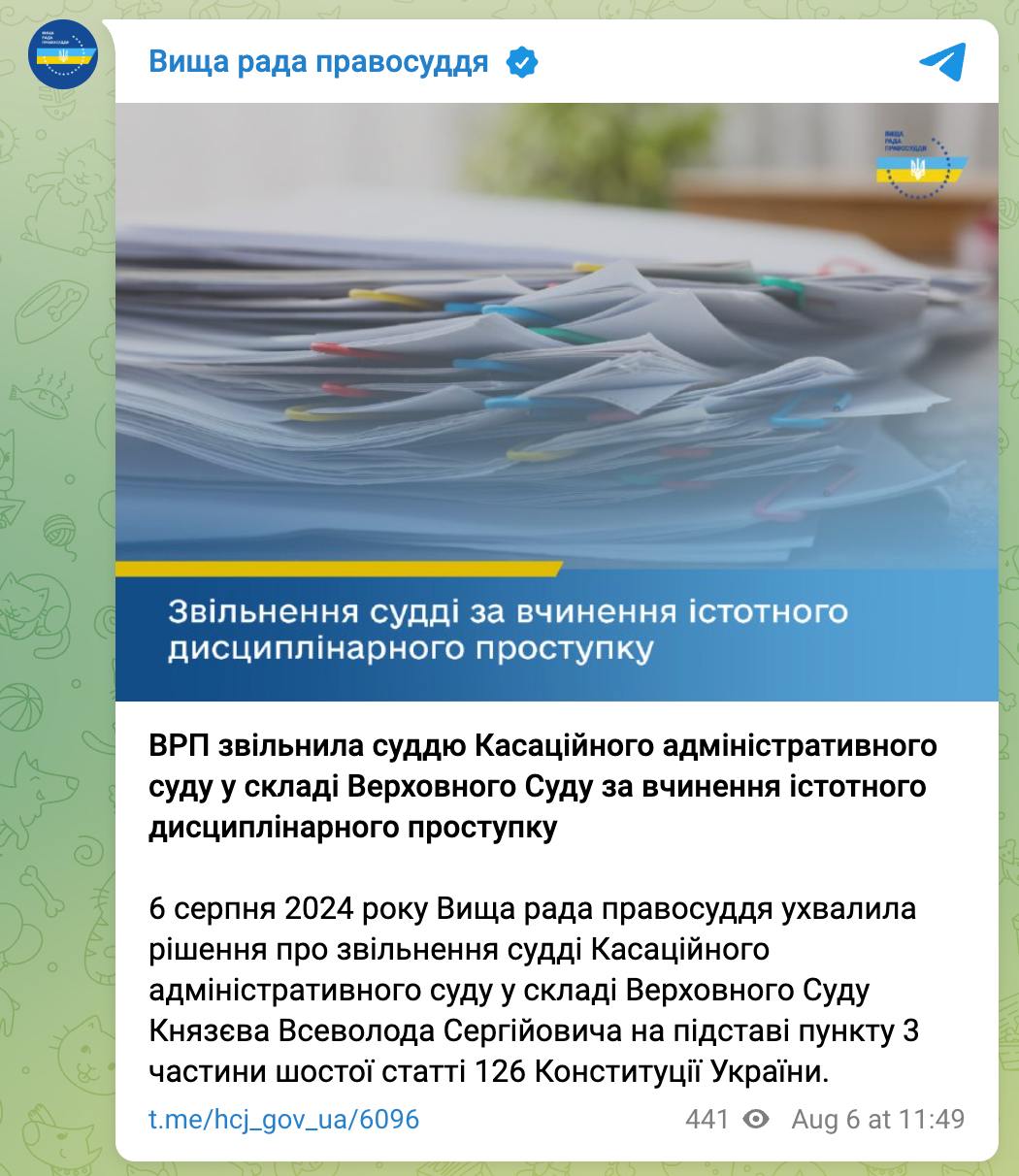 "6 августа Высший совет правосудия принял решение об увольнении судьи Кассационного административного суда в составе Верховного суда Князева Всеволода Сергеевича на основании пункта 3 части шестой статьи 126 Конституции Украины. 6 августа ВСП принял решение об увольнении судьи Макаровского районного суда Киевской области Тандыра Алексея Витальевича на основании пункта 3 части шестой статьи 126 Конституции Украины", - сказано в публикациях.