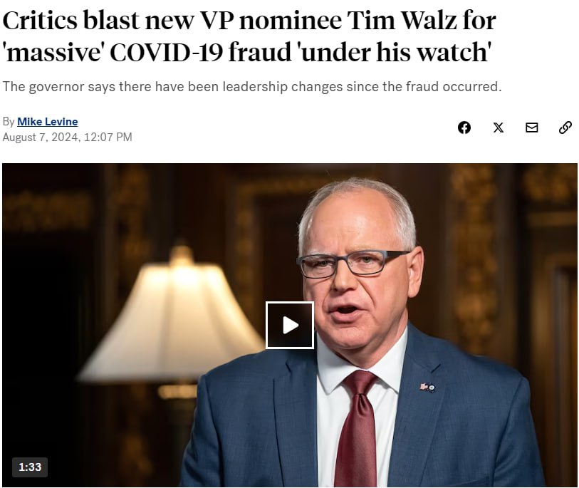 После того как Тим Уолц присоединился к кандидату в президенты от Демократической партии Камале Харрис в качестве возможного вице-президента, критики обвинили губернатора Миннесоты в бездействии по предотвращению масштабного мошенничества с COVID-19 в штате.