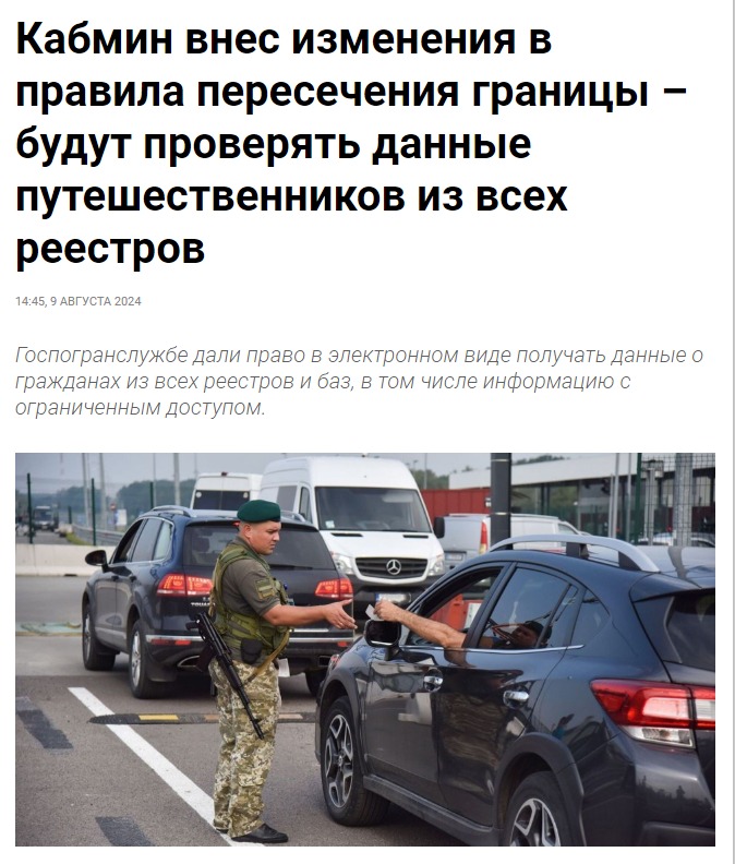 Кабинет министров дал Государственной погранслужбе Украины (ГПСУ) доступ ко всем электронным базам и реестрам, в том числе с ограниченным доступом. Также пограничники получат доступ к данным государственных и муниципальных банков. Это сделано для проверки украинцев, пересекающих границу.