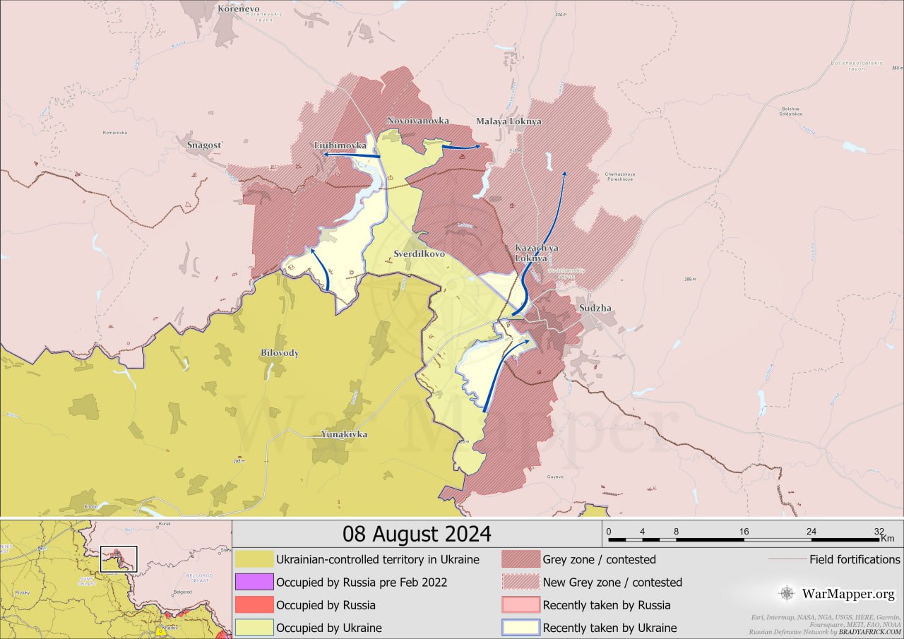 По этой карте, ВСУ отступили от Коренево, находятся на западных окраинах Суджи (не контролируя весь город), частично находятся в Новоивановке и полностью удерживают Свердликово.