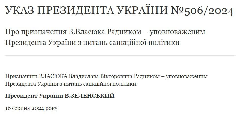 "Назначить Власюка Владислава Викторовича Советником – уполномоченным Президента Украины по вопросам санкционной политики", – говорится в указе.