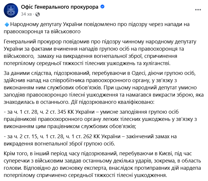 Генеральный прокурор сообщил о подозрении действующему народному депутату Украины по фактам совершения нападений группой лиц на правоохранителя и военного, покушения на похищение огнестрельного оружия, причинение потерпевшему средней тяжести телесных повреждений и хулиганство.