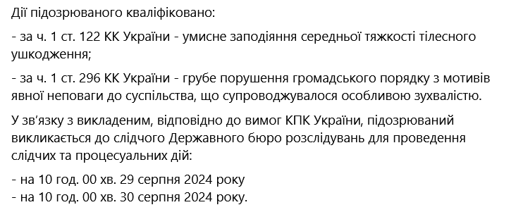 • по ч. 1 ст. 28, ч. 2 ст. 345 УК Украины – умышленное причинение группой лиц работнику правоохранительного органа легких телесных повреждений в связи с исполнением этим работником служебных обязанностей;