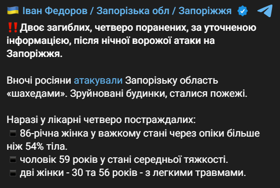 Ночью россияне атаковали Запорожскую область "Шахедами". Два человека погибли, еще четверо получили ранения. Разрушены дома, произошли пожары.
