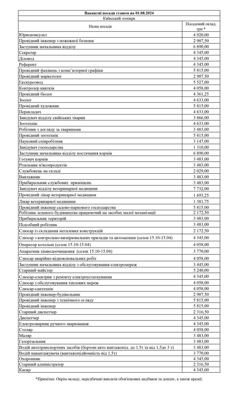 Киевский зоопарк "завлекает" работников окладами, иногда не дотягивающими до ста евро. Это следует из списка опубликованных на сайте зоопарка вакансий.