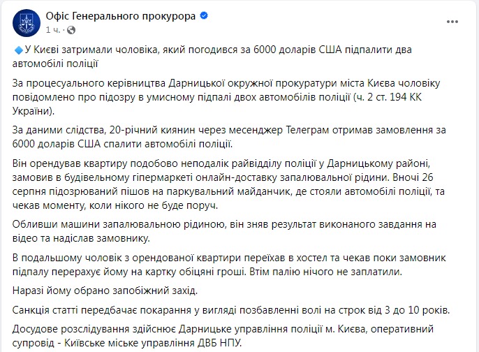 По данным следствия, 20-летний киевлянин в мессенджере Телеграм получил заказ за деньги сжечь автомобили полиции. Он арендовал квартиру посуточно недалеко от райотдела полиции в Дарницком районе, заказал в строительном гипермаркете онлайн-доставку зажигательной жидкости.  Ночью 26 августа подозреваемый пошел на парковку, где стояли автомобили полиции, и выждал момент, когда никого не будет рядом. Облив машины зажигательной жидкостью, он снял результат на видео и послал заказчику.