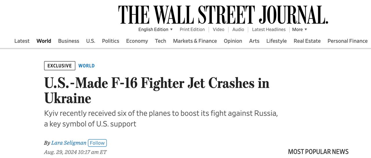 Один из шести переданных Украине истребителей F-16 разбился во время ракетной атаки РФ в понедельник. Об этом сообщило издание The Wall Street Journal со ссылкой на официальных представителей США.