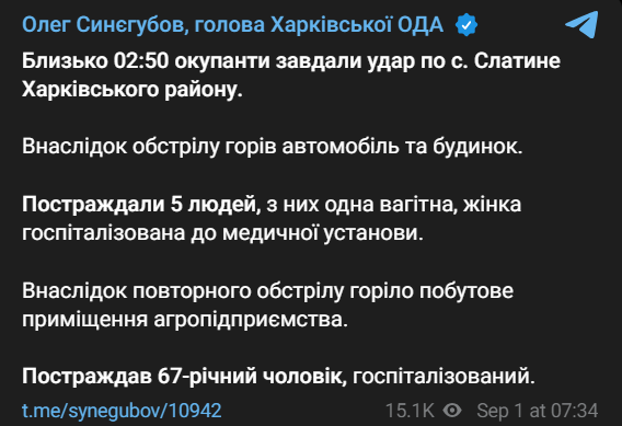 "Около 02:50 оккупанты нанесли удар по с. Слатино Харьковского района. В результате обстрела горел автомобиль и дом", - написал он.