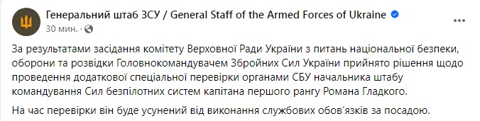 "По результатам заседания комитета Верховной Рады Украины по вопросам национальной безопасности, обороны и разведки главнокомандующим Вооруженными силами Украины принято решение о проведении дополнительной специальной проверки органами СБУ начальника штаба командования Сил беспилотных систем капитана первого ранга Романа Гладкого. На время проверки он будет отстранен от исполнения должностных обязанностей", - говорится в посте.
