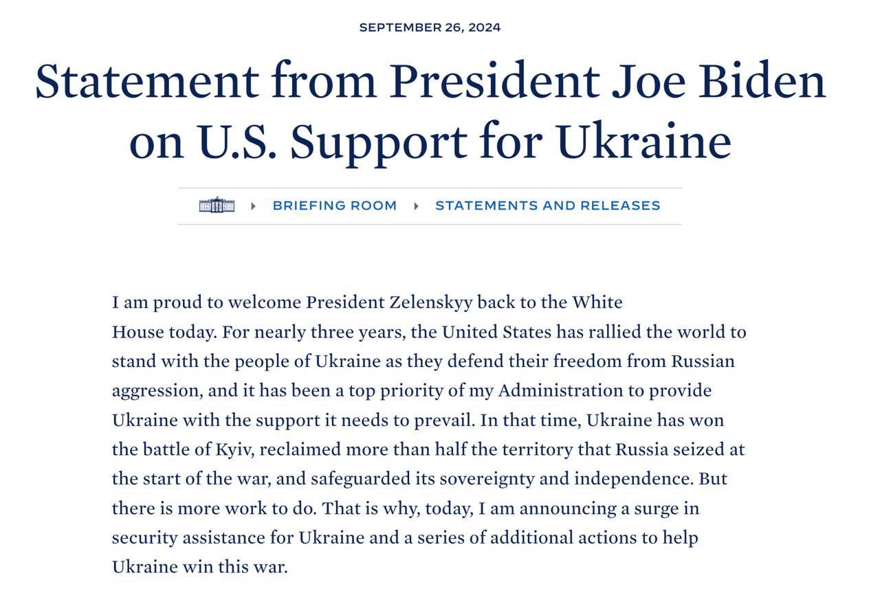 Информации о разрешении наносить дальнобойные удары по территории РФ западным оружием в пресс-релизе Белого дома нет.