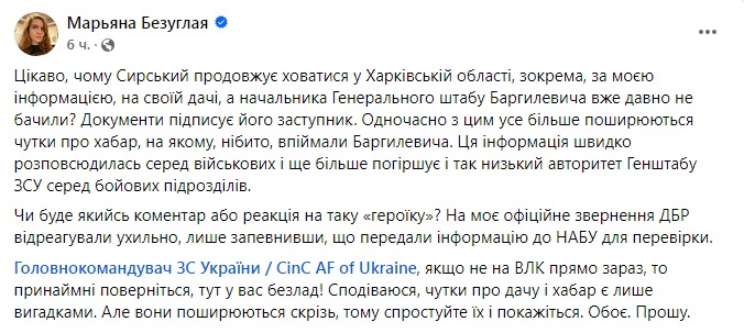 "Интересно, почему Сырский продолжает прятаться в Харьковской области, в частности, по моей информации, на своей даче, а начальника Генерального штаба Баргилевича уже давно не видели? Документы подписывает его заместитель. Одновременно с этим все больше распространяются слухи о взятках, на которых якобы поймали Баргилевича. Эта информация быстро распространилась среди военных и еще больше усугубляет и так низкий авторитет Генштаба ВСУ среди боевых подразделений", - пишет Безуглая.