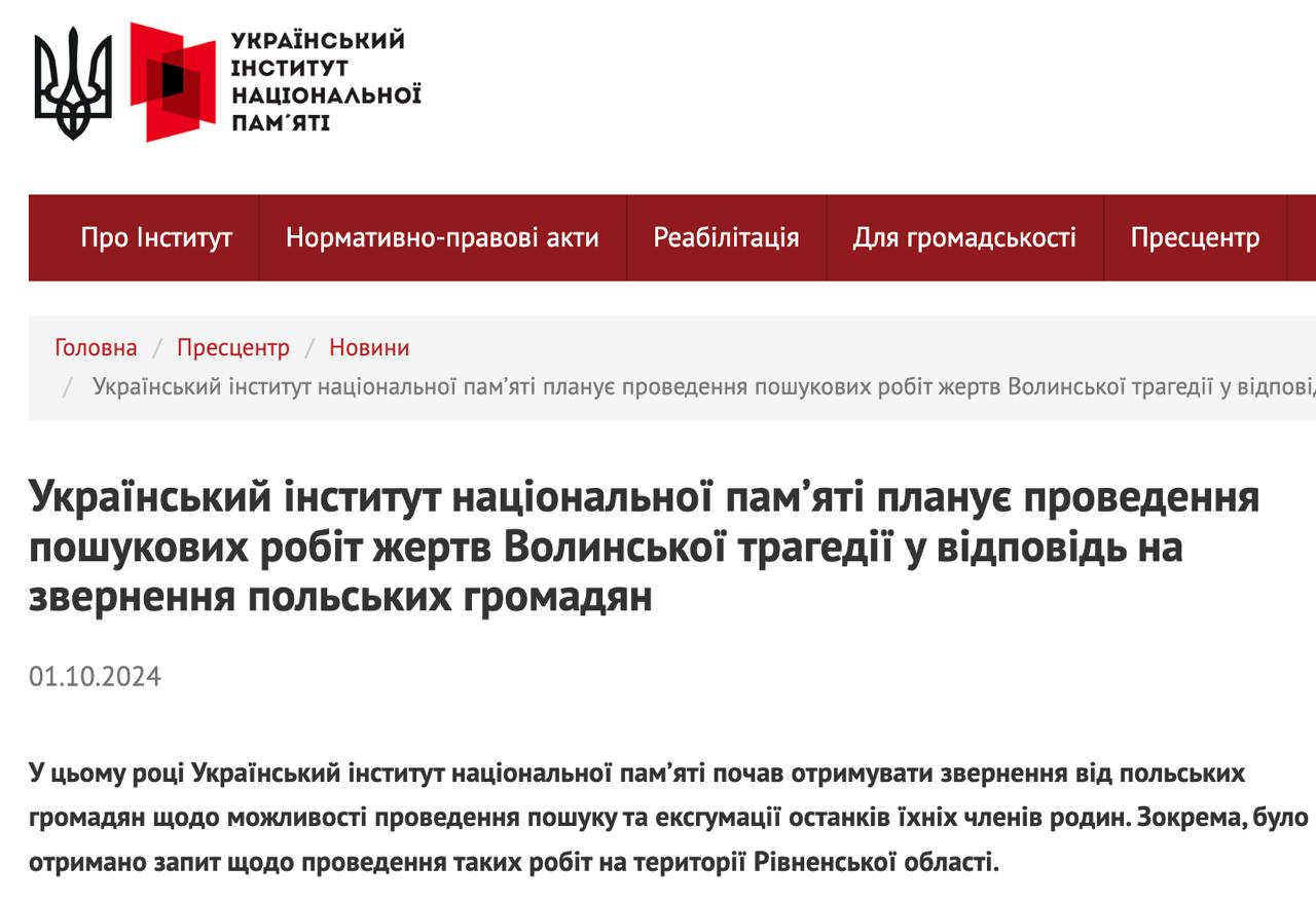 "В этом году Украинский институт национальной памяти начал получать обращения от польских граждан о возможности проведения поиска и эксгумации останков их членов семей. В частности, был получен запрос о проведении таких работ на территории Ровенской области. По результатам рассмотрения обращения, поступившего в сентябре 2024 года, Украинский институт национальной памяти намерен включить поисковые работы на территории Ровенской области в план работы и мероприятий на 2025 год", - сказано в сообщении.