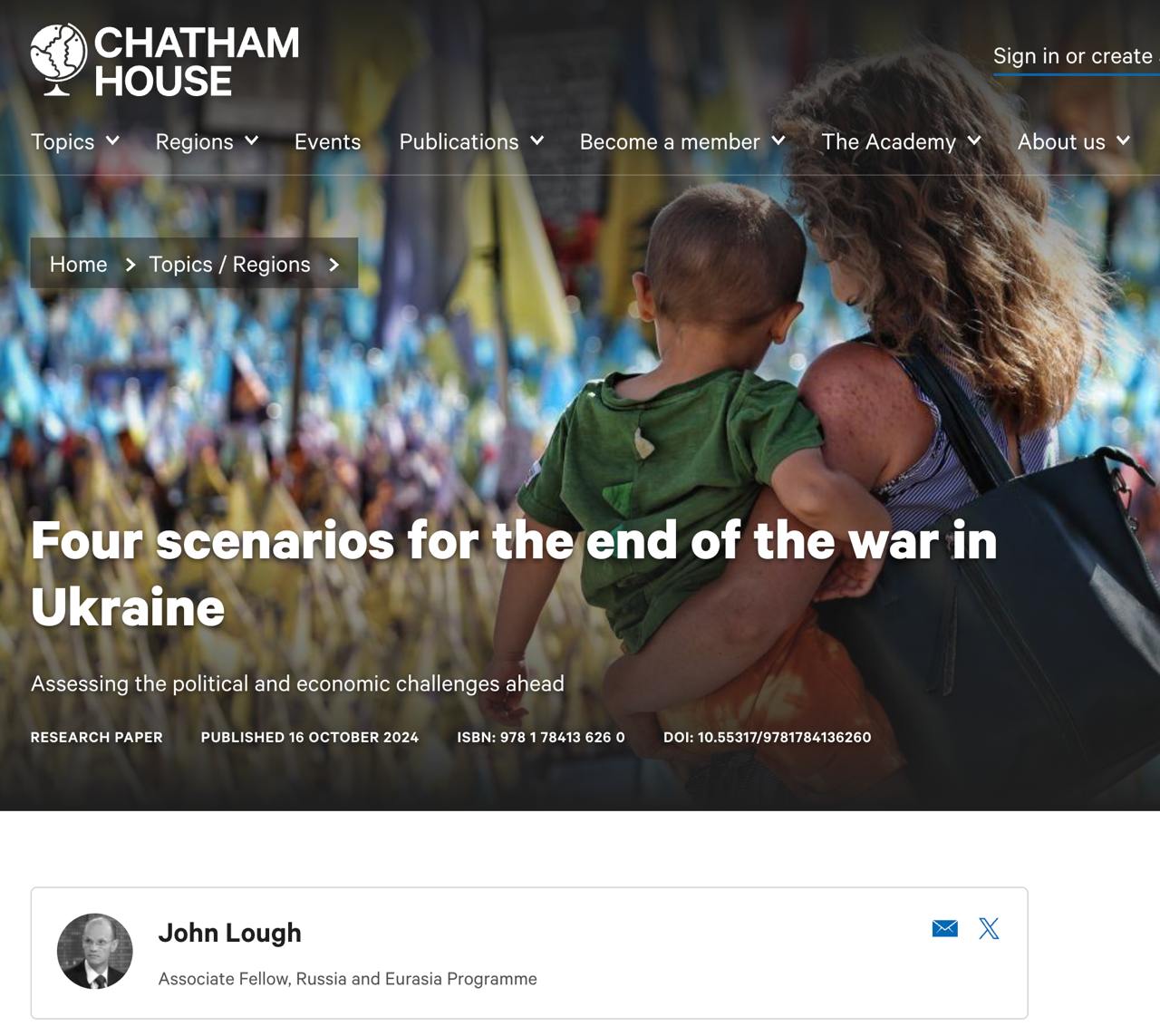 18:04 На сайте Chatham house (Королевский институт международных отношений) накануне выступления там Валерия Залужного вышла колонка Джона Лафа о четырех сценариях развития войны в Украине.