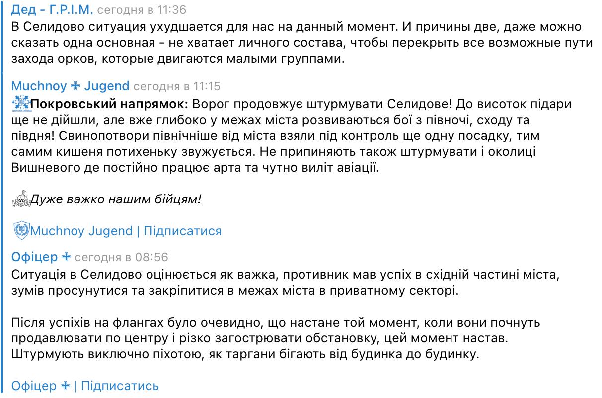 12:19 Украинские военные пишут об ухудшении ситуации в Селидово, где уже идут городские бои и осталась только одна дорога снабжения.