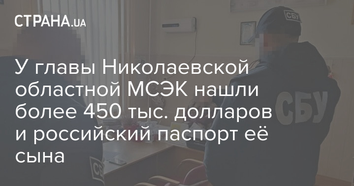 Служба безопасности Украины обнаружила у главы Николаевской областной медико-социальной экспертизы более 450 тысяч долларов, коллекцию ювелирных изделий и российский паспорт её сына.