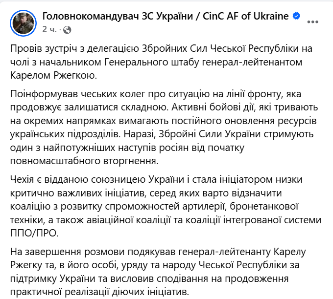 "Проинформировал чешских коллег о ситуации на линии фронта, которая продолжает оставаться сложной. Активные боевые действия, продолжающиеся в отдельных направлениях, требуют постоянного обновления ресурсов украинских подразделений", - написал Сырский.