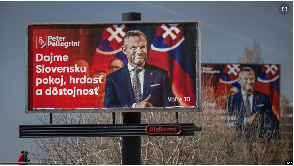 Перед вторым туром выборов по всей Словакии появились рекламные щиты с портретом Пеллегрини и надписью: "Словакия не отправит в Украину ни одного солдата". Его предшественница Зузана Чапутова выдала несколько разрешений.