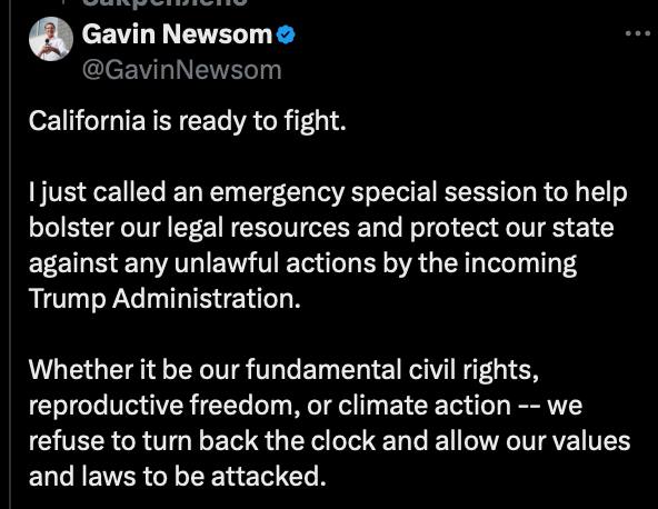 "Калифорния готова к борьбе. Я только что созвал экстренную специальную сессию, чтобы помочь укрепить наши правовые ресурсы и защитить наше государство от любых незаконных действий новой администрации Трампа", - написал Ньюсом в Х.