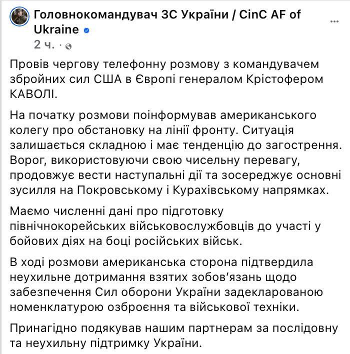 22:15 Ситуация в Донецкой области обостряется, заявил главком Сырский командующему силами США в Европе Кристоферу Каволи.