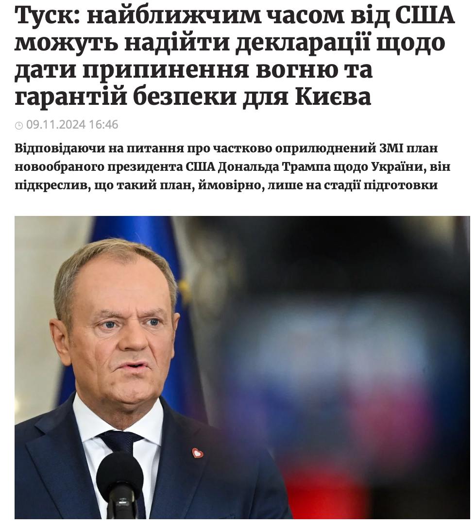 При этом Туск дал понять, что Польша с таким подходом не факт, что согласится. Он заявил, что «решения о войне в Украине не могут приниматься через головы не только украинцев, но и наши».
