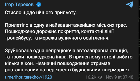 08:14 Ночью был прилет по объекту инфраструктуры в городе Синельниково Днепропетровской области.