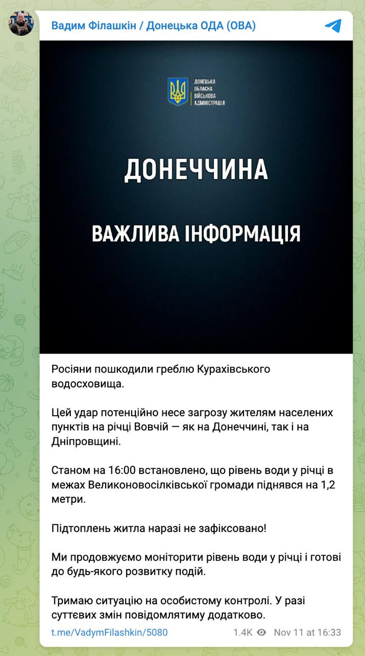 Донецкая областная военная администрация официально подтвердила повреждение дамбы Кураховского водохранилища и заявила, что это сделала армия РФ.