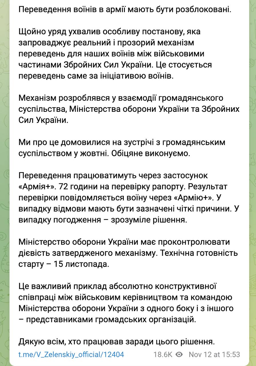 16.00 Кабмин принял постановление, которое должно разблокировать для военных возможность перевода из одной части в другую, сообщает Зеленский.