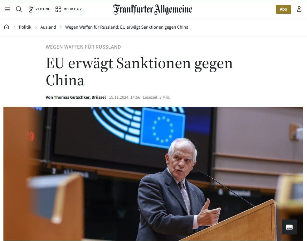 Европейский Союз собирается ввести санкции против Китая из-за того, что тот начал поставлять оружие России.