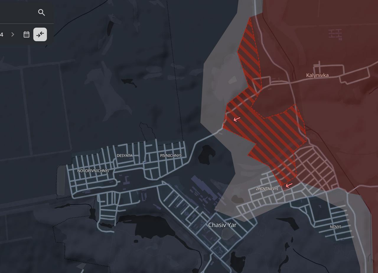 8.38 Россияне продолжают продвигаться в Часове Яре, сообщает украинский военный паблик Deep State.