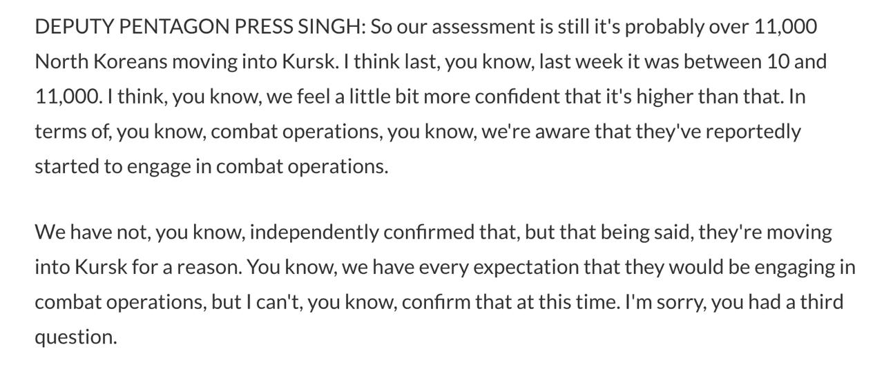 "Мы знаем, что они, как сообщается, начали участвовать в боевых операциях. Мы не получили независимого подтверждения этого, но они направляются в Курск по какой-то причине. У нас есть все основания полагать, что они будут участвовать в боевых действиях, но я не могу подтвердить это в данный момент", - сказала Сингх.