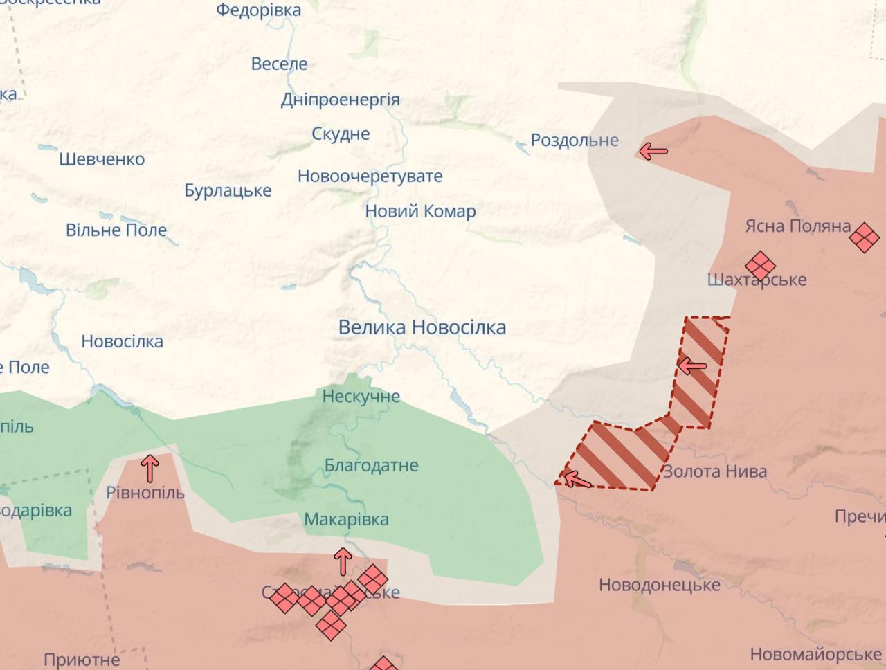 Лейтенант ВСУ с позывным Алекс пишет, что на востоке противник активизировался около Раздольного, а на западе штурм идет с района Ровнополья с целью выйти на трассу Новоселка – Великая Новоселка. Таким образом, по его мнению, россияне хотят обойти Великую Новоселку.