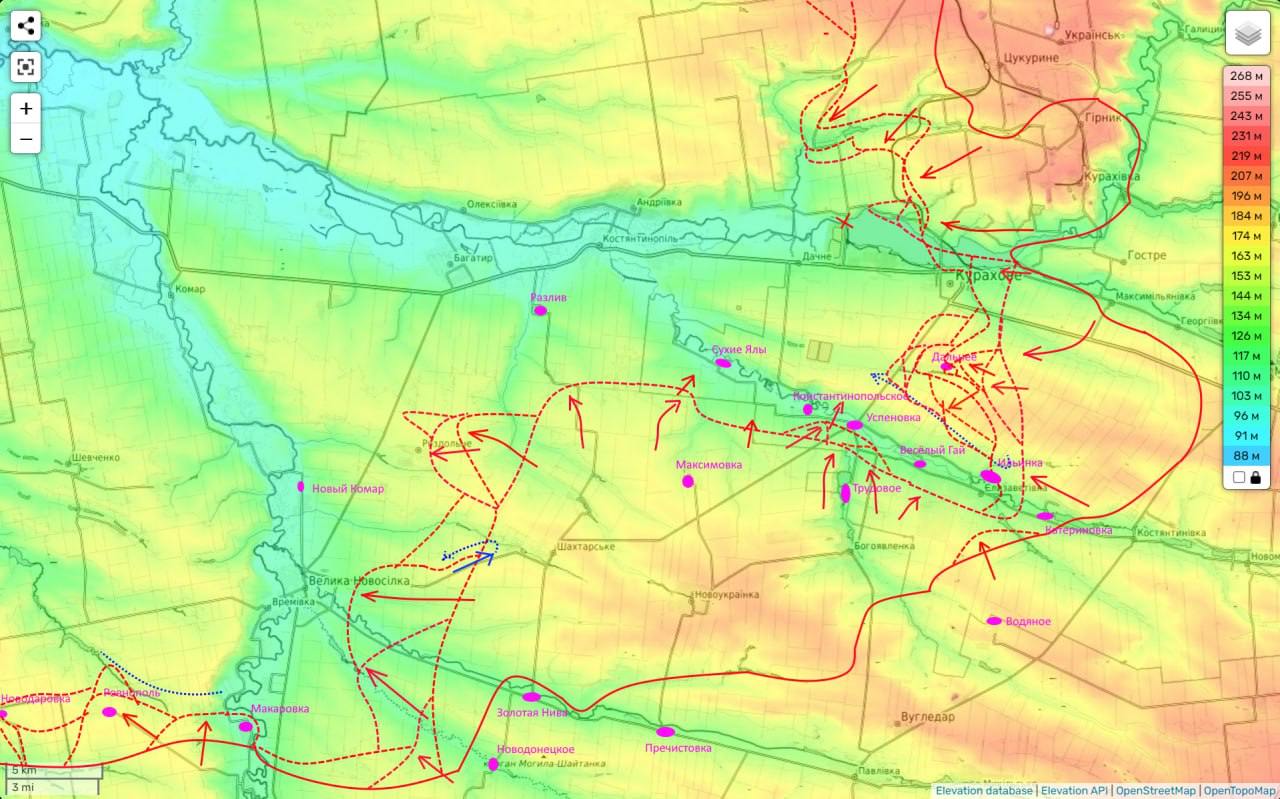 Российские паблики утверждают, что на восточном фланге около Раздольного им удалось за день пройти 4-5 км и практически перерезать трассу на Великую Новоселку с севера - с Богатыря.