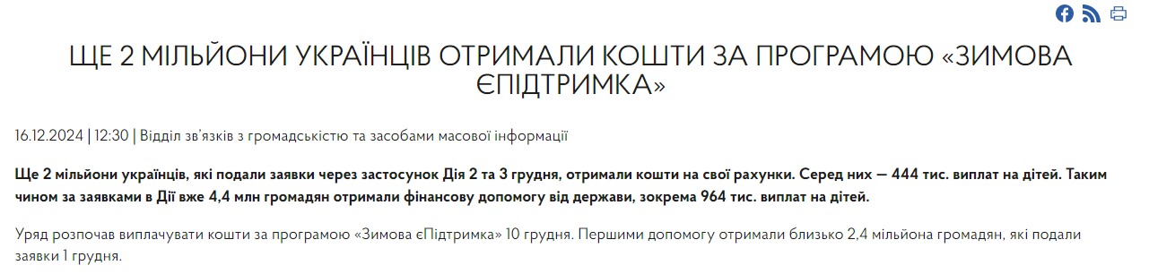 "По состоянию на 16 декабря общее количество заявок в "Дие" достигло 7,5 миллиона, из них 2 миллиона - на выплаты для детей. В процессе проверки около 130 тысяч заявок было отклонено из-за несоответствия условиям программы, в частности от граждан, находящихся за границей", - сказано в пресс-релизе.