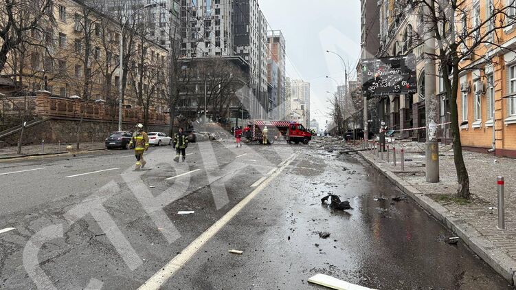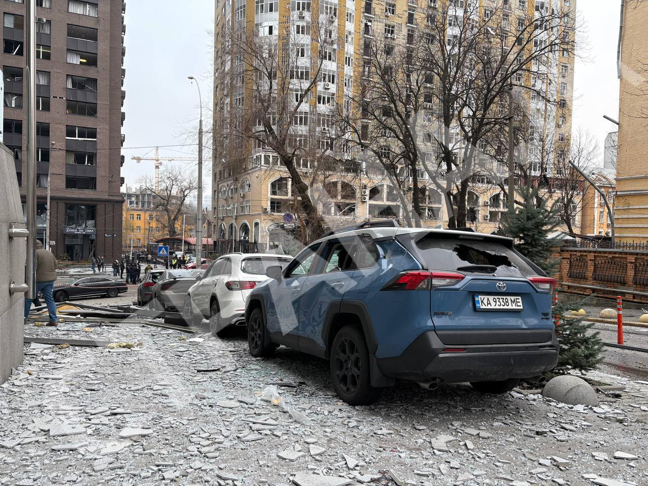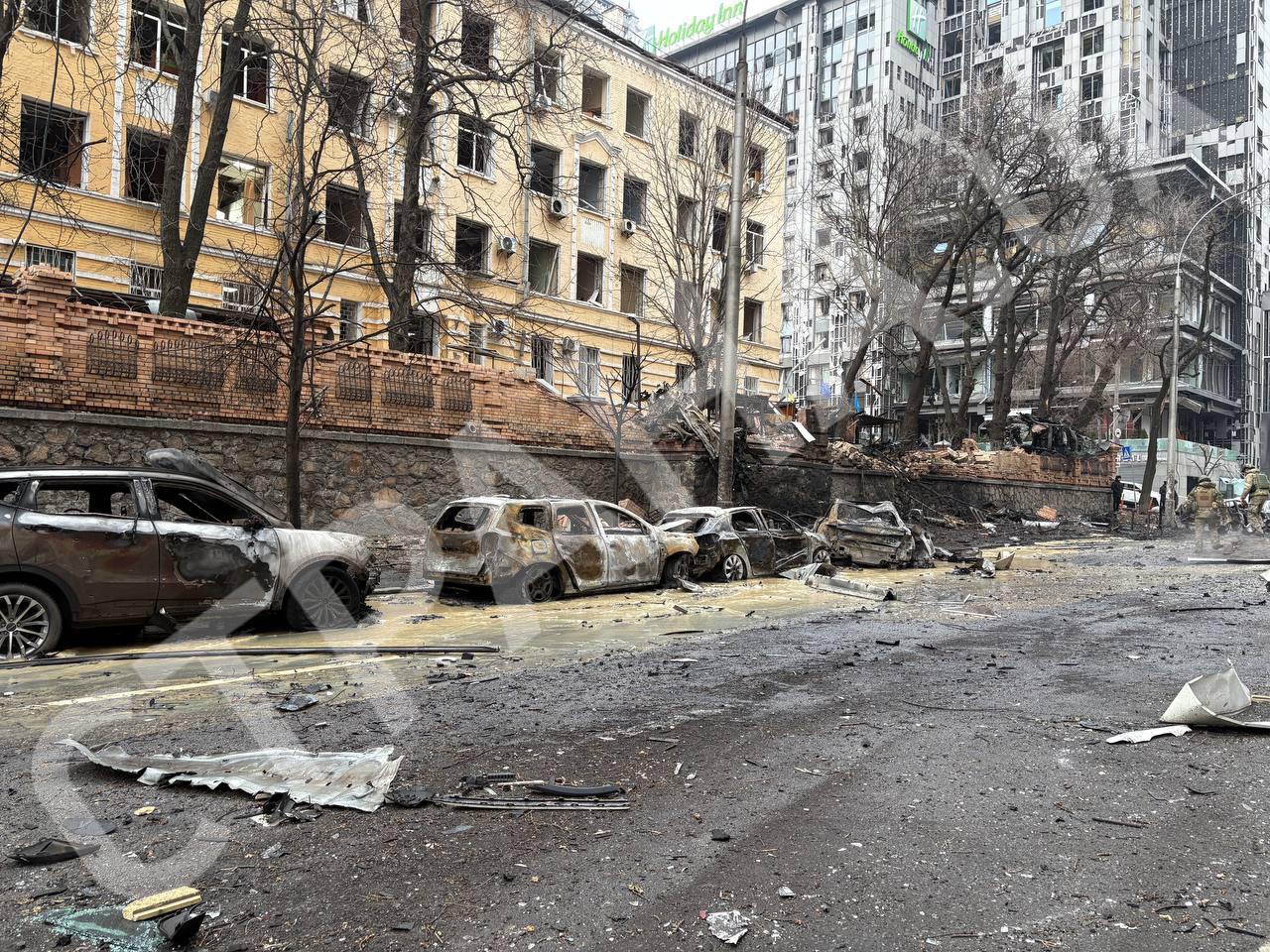 Фото и видео последствий ракетной атаки в районе БЦ "Торонто" на Большой Васильевской в Киеве. Полностью уничтожено около 10 автомобиле еще двадцать получили повреждения. Повреждены фасады двух жилых домов.